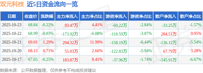 证券之星消息,截至2025年10月23日收盘,双元科技(688623)报收于68.84元,下跌0.22%,换手率1.62%,成交量3099.0手,成交额2120.67万元。