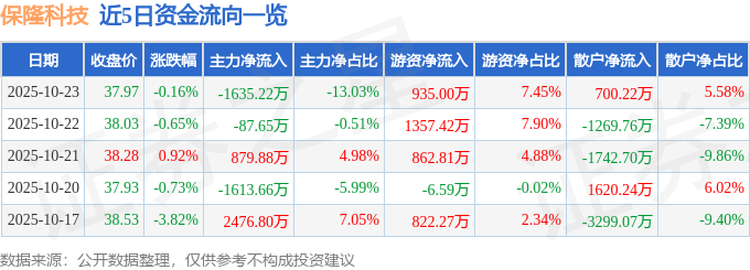 证券之星消息,截至2025年10月23日收盘,保隆科技(603197)报收于37.97元,下跌0.16%,换手率1.56%,成交量3.33万手,成交额1.26亿元。