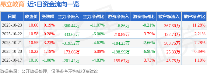 证券之星消息,截至2025年10月23日收盘,昂立教育(600661)报收于10.6元,上涨0.19%,换手率1.07%,成交量3.08万手,成交额3256.17万元。