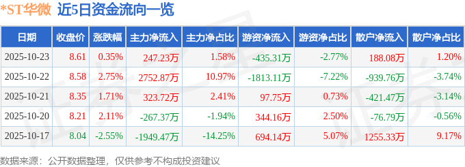 证券之星消息,截至2025年10月23日收盘,*ST华微(600360)报收于8.61元,上涨0.35%,换手率1.9%,成交量18.29万手,成交额1.57亿元。