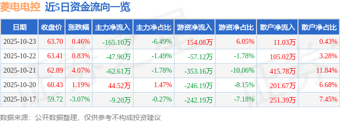 10月23日的资金流向数据方面,主力资金净流出165.1万元,占总成交额6.49%,游资资金净流入154.08万元,占总成交额6.05%,散户资金净流入11.03万元,占总成交额0.43%。
