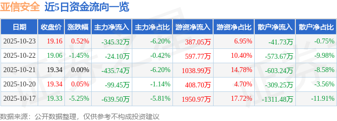 证券之星消息,截至2025年10月23日收盘,亚信安全(688225)报收于19.16元,上涨0.52%,换手率0.74%,成交量2.95万手,成交额5570.18万元。