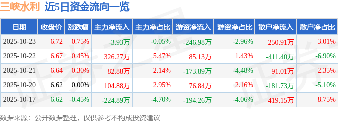 证券之星消息,截至2025年10月23日收盘,三峡水利(600116)报收于6.72元,上涨0.75%,换手率0.65%,成交量12.43万手,成交额8330.67万元。
