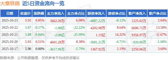 证券之星消息,截至2025年10月23日收盘,大秦铁路(601006)报收于5.92元,上涨0.85%,换手率0.51%,成交量101.81万手,成交额6.02亿元。