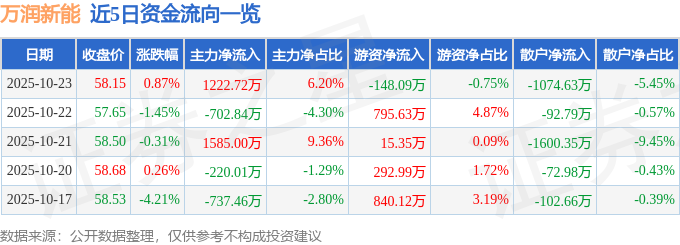 证券之星消息,截至2025年10月23日收盘,万润新能(688275)报收于58.15元,上涨0.87%,换手率4.08%,成交量3.45万手,成交额1.97亿元。