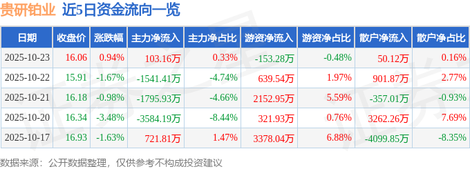证券之星消息,截至2025年10月23日收盘,贵研铂业(600459)报收于16.06元,上涨0.94%,换手率2.67%,成交量20.11万手,成交额3.17亿元。