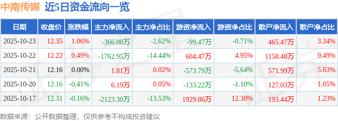 证券之星消息,截至2025年10月23日收盘,中南传媒(601098)报收于12.35元,上涨1.06%,换手率0.63%,成交量11.33万手,成交额1.39亿元。