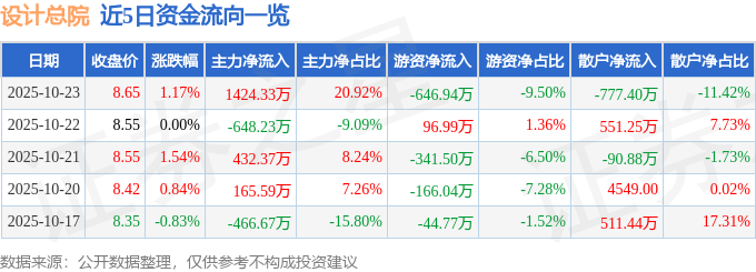 证券之星消息,截至2025年10月23日收盘,设计总院(603357)报收于8.65元,上涨1.17%,换手率1.42%,成交量7.91万手,成交额6809.3万元。