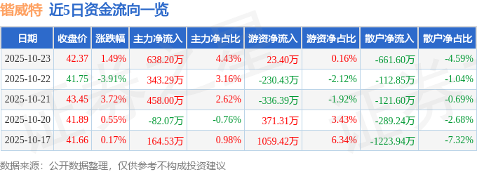 10月23日的资金流向数据方面,主力资金净流入638.2万元,占总成交额4.43%,游资资金净流入23.4万元,占总成交额0.16%,散户资金净流出661.6万元,占总成交额4.59%。