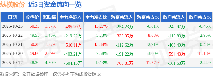 证券之星消息,截至2025年10月23日收盘,纵横股份(688070)报收于50.33元,上涨1.57%,换手率0.86%,成交量7537.0手,成交额3732.85万元。