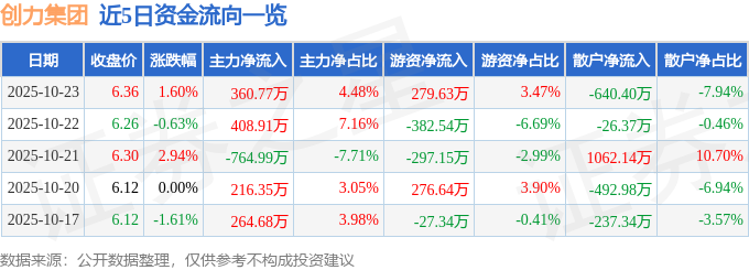 证券之星消息,截至2025年10月23日收盘,创力集团(603012)报收于6.36元,上涨1.6%,换手率1.98%,成交量12.8万手,成交额8060.77万元。