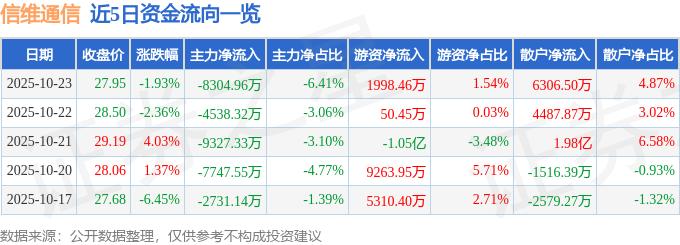 证券之星消息,截至2025年10月23日收盘,信维通信(300136)报收于27.95元,下跌1.93%,换手率5.68%,成交量46.86万手,成交额12.96亿元。
