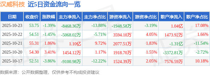10月23日的资金流向数据方面,主力资金净流出8468.36万元,占总成交额13.88%,游资资金净流出1948.58万元,占总成交额3.19%,散户资金净流入1.04亿元,占总成交额17.08%。