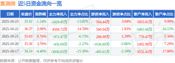 证券之星消息,截至2025年10月23日收盘,富满微(300671)报收于35.92元,下跌1.24%,换手率2.4%,成交量5.2万手,成交额1.86亿元。