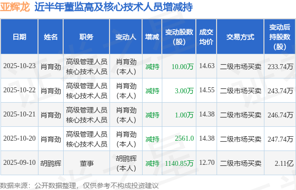 证券之星消息,根据10月23日市场公开信息、上市公司公告及交易所披露数据整理,亚辉龙(688575)最新董监高及相关人员股份变动情况:2025年10月22日至2025年10月23日公司高级管理人员,核心技术人员肖育劲共减持公司股份13.0万股,占公司总股本为0.0228%。变动期间公司股价上涨1.8%,10月23日当日收盘报14.68元。