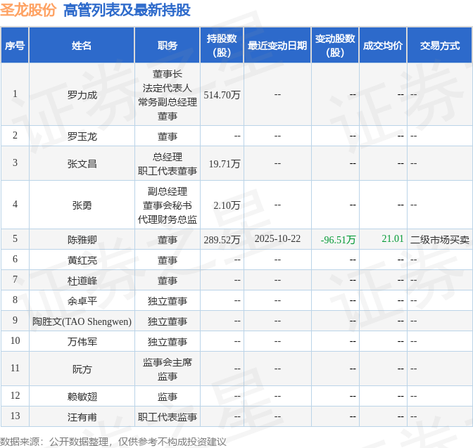 圣龙股份近半年内的董监高及核心技术人员增减持详情如下: