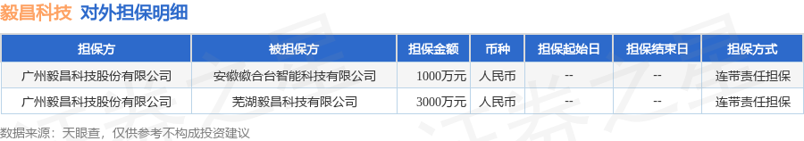 毅昌科技10月21日披露2笔对外担保,被担保公司2家。对外担保明细如下表: