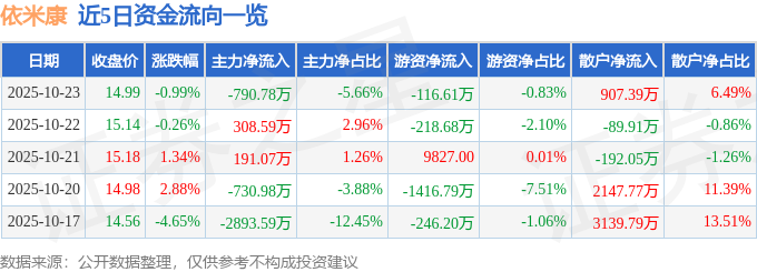 10月23日的资金流向数据方面,主力资金净流出790.78万元,占总成交额5.66%,游资资金净流出116.61万元,占总成交额0.83%,散户资金净流入907.39万元,占总成交额6.49%。