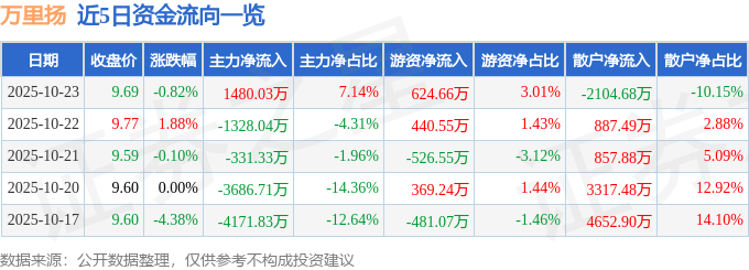 证券之星消息,截至2025年10月23日收盘,万里扬(002434)报收于9.69元,下跌0.82%,换手率1.64%,成交量21.55万手,成交额2.07亿元。
