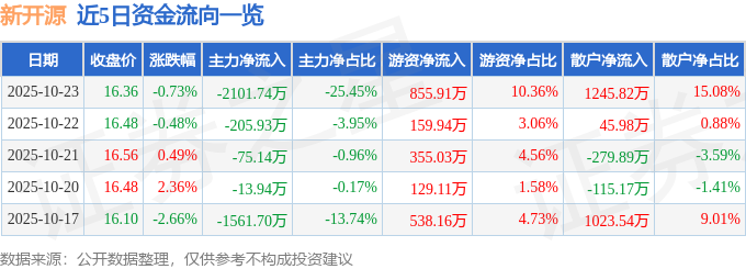 证券之星消息,截至2025年10月23日收盘,新开源(300109)报收于16.36元,下跌0.73%,换手率1.13%,成交量5.1万手,成交额8259.39万元。