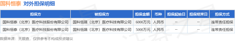 国科恒泰10月16日披露2笔对外担保,被担保方为国科恒晟(北京)医疗科技有限公司。对外担保明细如下表: