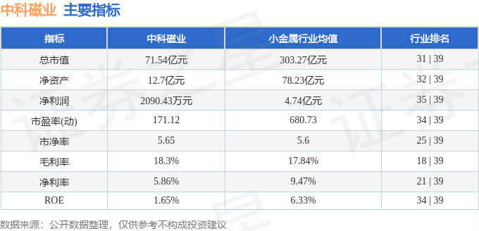 中科磁业2025年中报显示,公司主营收入3.47亿元,同比上升38.46%;归母净利润2090.43万元,同比上升271.78%;扣非净利润1740.84万元,同比上升341.29%;其中2025年第二季度,公司单季度主营收入1.93亿元,同比上升41.27%;单季度归母净利润746.59万元,同比上升373.05%;单季度扣非净利润611.26万元,同比上升164.89%;负债率22.79%,投资收益108.01万元,财务费用-18.86万元,毛利率18.3%。中科磁业(301141)主营业务:主要从事永磁材料的研发、生产和销售。