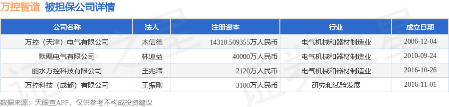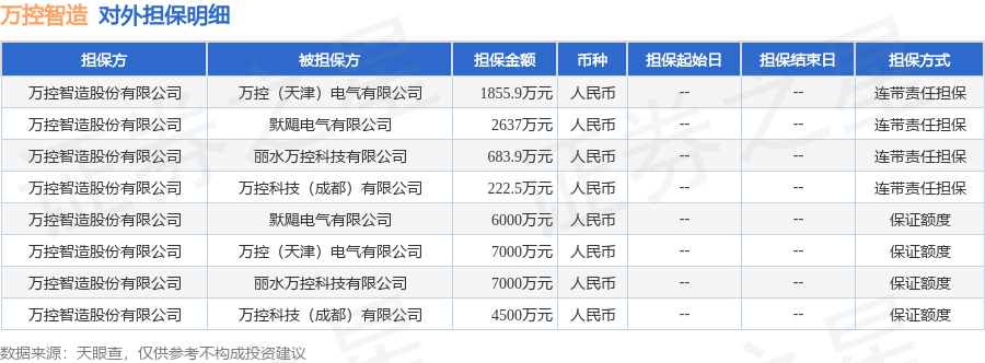 万控智造10月16日披露8笔对外担保,被担保公司4家。对外担保明细如下表: