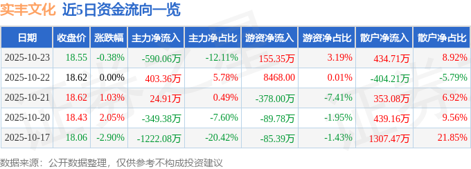 证券之星消息,截至2025年10月23日收盘,实丰文化(002862)报收于18.55元,下跌0.38%,换手率2.09%,成交量2.64万手,成交额4871.15万元。