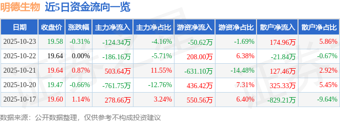 证券之星消息,截至2025年10月23日收盘,明德生物(002932)报收于19.58元,下跌0.31%,换手率0.98%,成交量1.53万手,成交额2988.13万元。