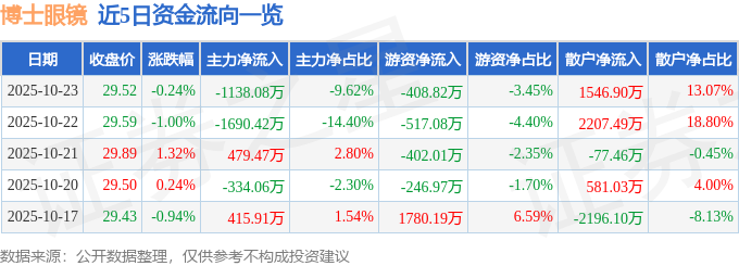 证券之星消息,截至2025年10月23日收盘,博士眼镜(300622)报收于29.52元,下跌0.24%,换手率2.59%,成交量4.04万手,成交额1.18亿元。