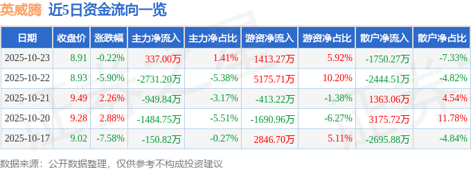10月23日的资金流向数据方面,主力资金净流入337.0万元,占总成交额1.41%,游资资金净流入1413.27万元,占总成交额5.92%,散户资金净流出1750.27万元,占总成交额7.33%。