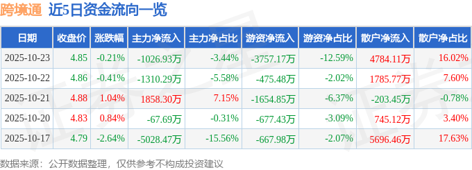 证券之星消息,截至2025年10月23日收盘,跨境通(002640)报收于4.85元,下跌0.21%,换手率4.03%,成交量62.35万手,成交额2.99亿元。