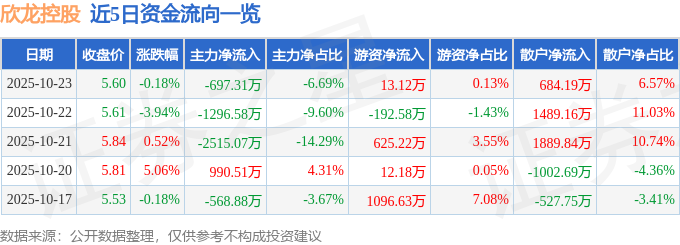 证券之星消息,截至2025年10月23日收盘,欣龙控股(000955)报收于5.6元,下跌0.18%,换手率3.46%,成交量18.61万手,成交额1.04亿元。