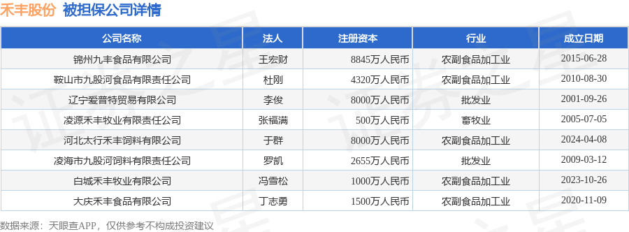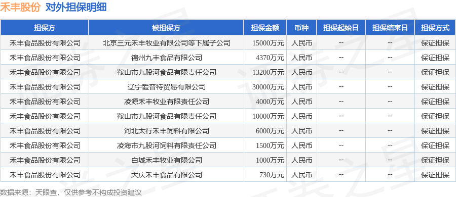 禾丰股份10月14日披露10笔对外担保,被担保公司9家。对外担保明细如下表: