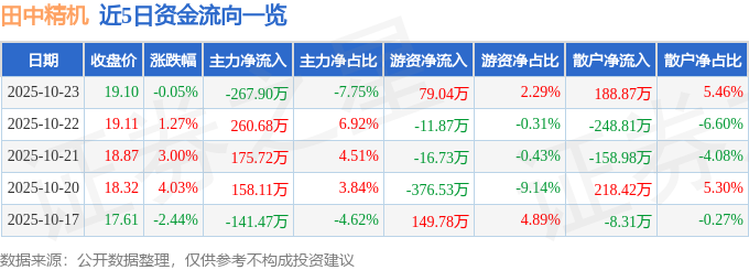 证券之星消息,截至2025年10月23日收盘,田中精机(300461)报收于19.1元,下跌0.05%,换手率1.6%,成交量1.82万手,成交额3458.41万元。