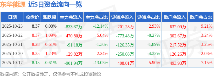 证券之星消息,截至2025年10月23日收盘,东华能源(002221)报收于8.37元,上涨0.0%,换手率0.56%,成交量8.23万手,成交额6863.51万元。