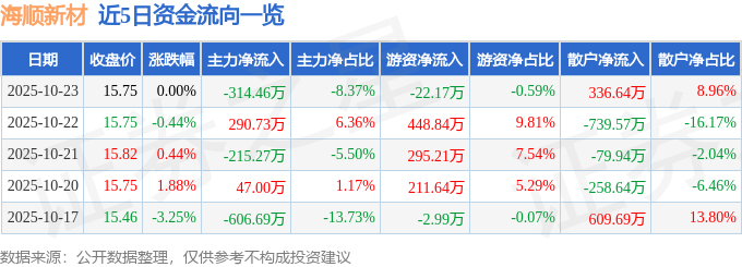 证券之星消息,截至2025年10月23日收盘,海顺新材(300501)报收于15.75元,上涨0.0%,换手率1.92%,成交量2.4万手,成交额3755.63万元。