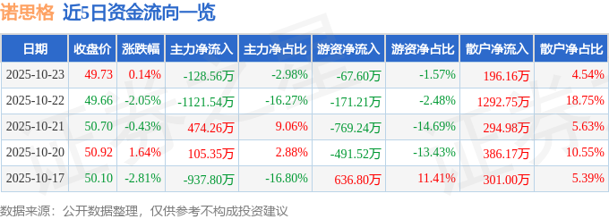 证券之星消息,截至2025年10月23日收盘,诺思格(301333)报收于49.73元,上涨0.14%,换手率1.53%,成交量8752.0手,成交额4319.54万元。