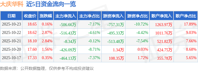 证券之星消息,截至2025年10月23日收盘,大庆华科(000985)报收于18.65元,上涨0.16%,换手率2.94%,成交量3.81万手,成交额7064.43万元。