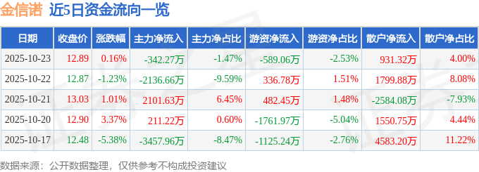 证券之星消息,截至2025年10月23日收盘,金信诺(300252)报收于12.89元,上涨0.16%,换手率3.28%,成交量18.35万手,成交额2.33亿元。