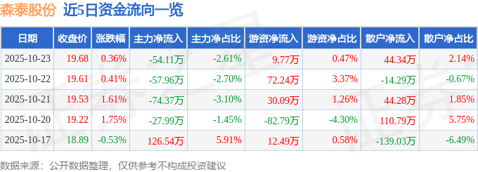 证券之星消息,截至2025年10月23日收盘,森泰股份(301429)报收于19.68元,上涨0.36%,换手率2.41%,成交量1.06万手,成交额2075.55万元。