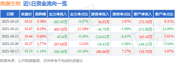 证券之星消息,截至2025年10月23日收盘,美康生物(300439)报收于10.51元,上涨0.38%,换手率1.08%,成交量3.15万手,成交额3280.74万元。