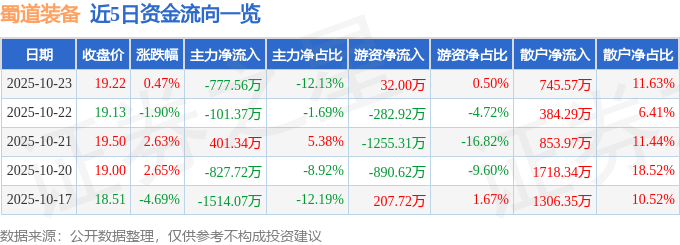 10月23日的资金流向数据方面,主力资金净流出777.56万元,占总成交额12.13%,游资资金净流入32.0万元,占总成交额0.5%,散户资金净流入745.57万元,占总成交额11.63%。