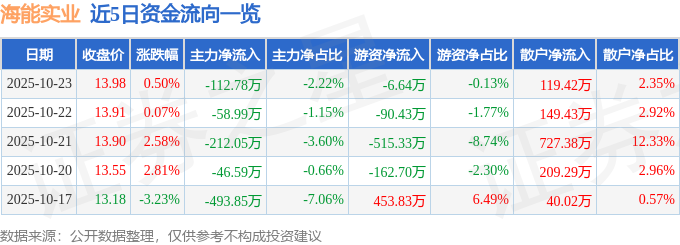 证券之星消息,截至2025年10月23日收盘,海能实业(300787)报收于13.98元,上涨0.5%,换手率1.92%,成交量3.67万手,成交额5081.78万元。