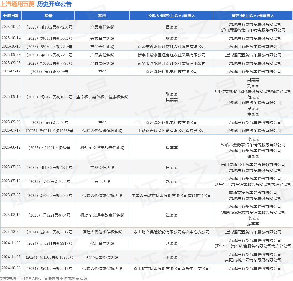 案号:(2025)川1102民初4238号根据统计,近一年内以上汽通用五菱汽车股份有限公司为当事人的历史开庭公告有18则,其中案由为“产品责任纠纷”的公告以5则居首,其次为“保险人代位求偿权纠纷”有4则,“其他”有2则。历史开庭公告如下: