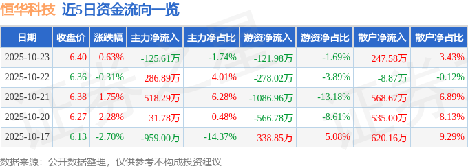 证券之星消息,截至2025年10月23日收盘,恒华科技(300365)报收于6.4元,上涨0.63%,换手率2.23%,成交量11.42万手,成交额7224.31万元。