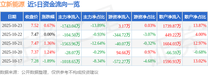 证券之星消息,截至2025年10月23日收盘,立新能源(001258)报收于7.52元,上涨0.67%,换手率1.8%,成交量16.76万手,成交额1.25亿元。