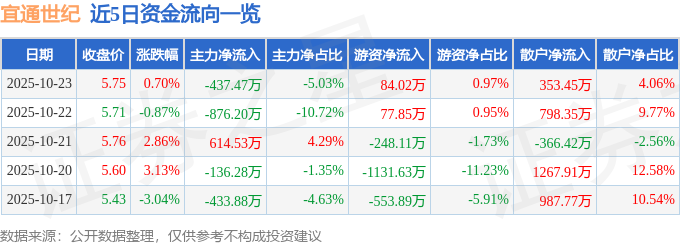 证券之星消息,截至2025年10月23日收盘,宜通世纪(300310)报收于5.75元,上涨0.7%,换手率2.21%,成交量15.3万手,成交额8701.91万元。