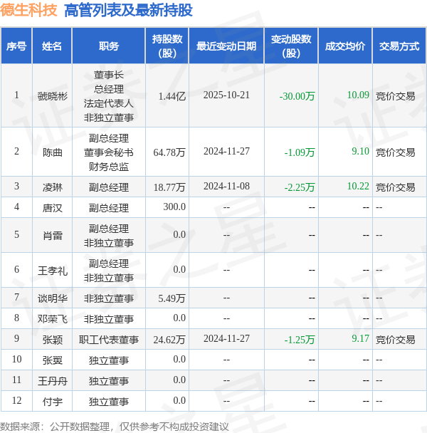 德生科技近半年内的董监高及核心技术人员增减持详情如下:
