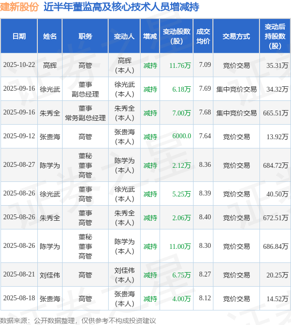 建新股份近半年内的董监高及核心技术人员增减持详情如下: